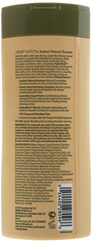Get the dark color you want instantly! Strong natural bronzers are perfectly blended to deliver a gorgeous, deeply bronzed look while a hemp seed hydrating complex provides luxurious, locked-in hydration. A trio of Australian super fruits also protects against free radicals and other harsh environmental elements. Fragrance: tropical colada. Instant natural bronzer. Thc-drug & paraben-free. Hemp seed hydrating complex.Feature