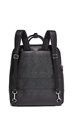 -. Feature : Add-a-bag strap, double zip closure on main compartment, zipped laptop compartment, 1 front pocket, back pocket with snap closure, adjustable backpack straps that tuck away, leather grab handle / 1 zip pocket, 1 jewelry pocket, 2 media pockets, pen loops / 3.5x13.25x15.5