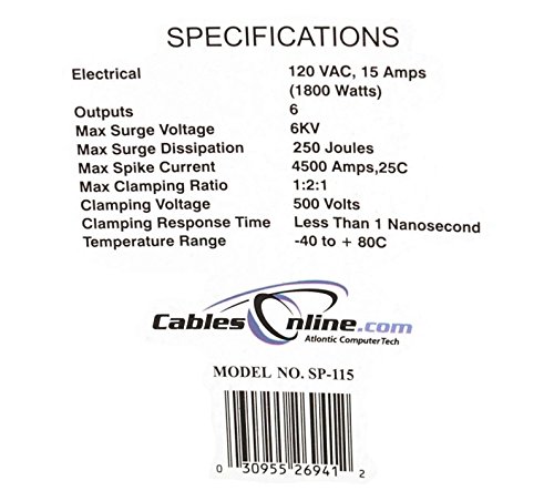 CablesOnline 6 Outlet Surge Strip , Horizontal , 250 Joules, (6 ft.) Cable, with Right Angle Plug
