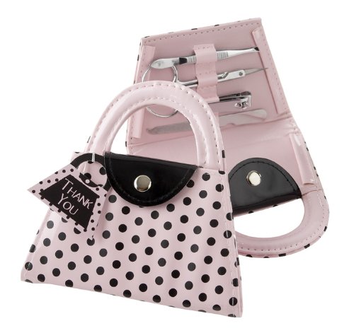 - Feature : A charming purse shaped thank you tag adds to the presentation / The 4 piece stainless steel set includes nail file, scissors, clippers, and tweezers and fits perfectly in the pink and black polka dot purse / Measures 513" x 55"