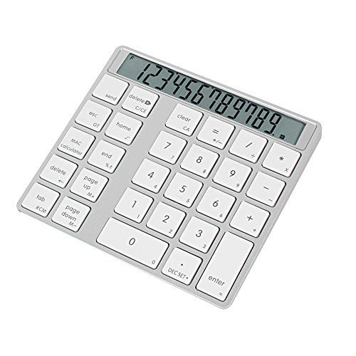 -. Feature : The Bluetooth numeric keypad with Calculater 12-digital desktop.Can use a calculator or the keyboard mode The switch (MAC/CAL) between them. / Only 1/3-inch thick: Ultra-thin design adds sleek style to your workspace.Aluminum enclosure,perfectly matchs Apple keyboard Compact, convenient wireless keyboard backspace,Big, full size, soft concave button to improve efficiency. / When calculator and computer connection, you can click "connect" button to connect to the computer, and then you can press the "send" key calculation results will be sent to the computer. / Keyboard digital display is clear, effective distance of 10 meters and Bluetooth3.0 operation.28 key design, the key is suitable for the size of the office. / Compatible with Mac OS X 10.6 & higher / Windows 98SE /ME /2000 /XP /Vista /7/8 /10