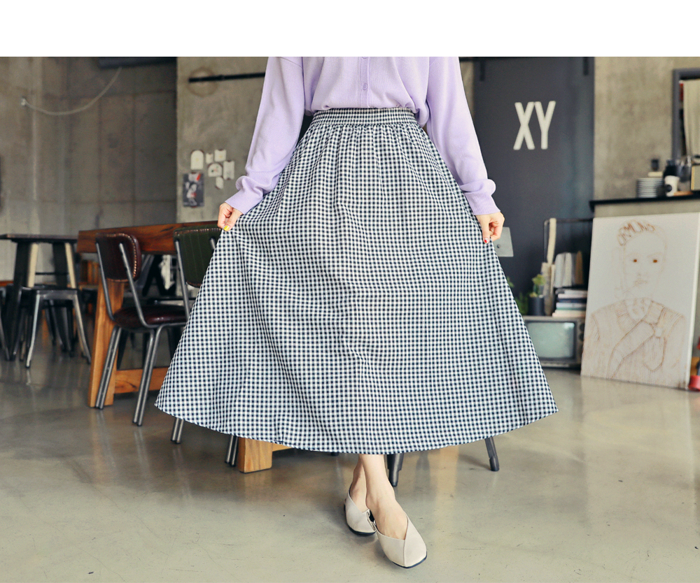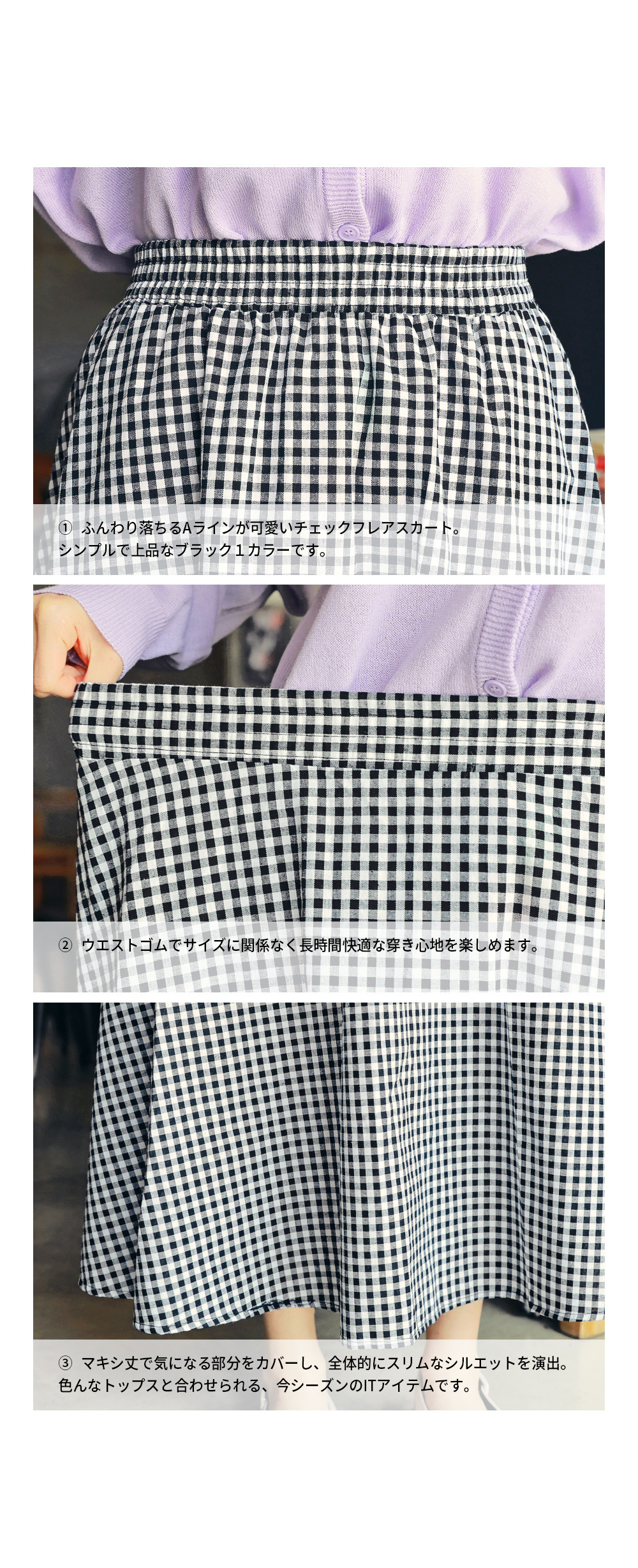 ブラック1カラー展開のギンガムチェックフレアスカートをご紹介します。ウエストゴムで長時間の着用もラクちん◎マキシ丈でトレンド感を演出できます♡いろんなトップスとスタイリングを楽しめます。レッグラインのカバーを叶える今シーズンオススメのアイテムです。