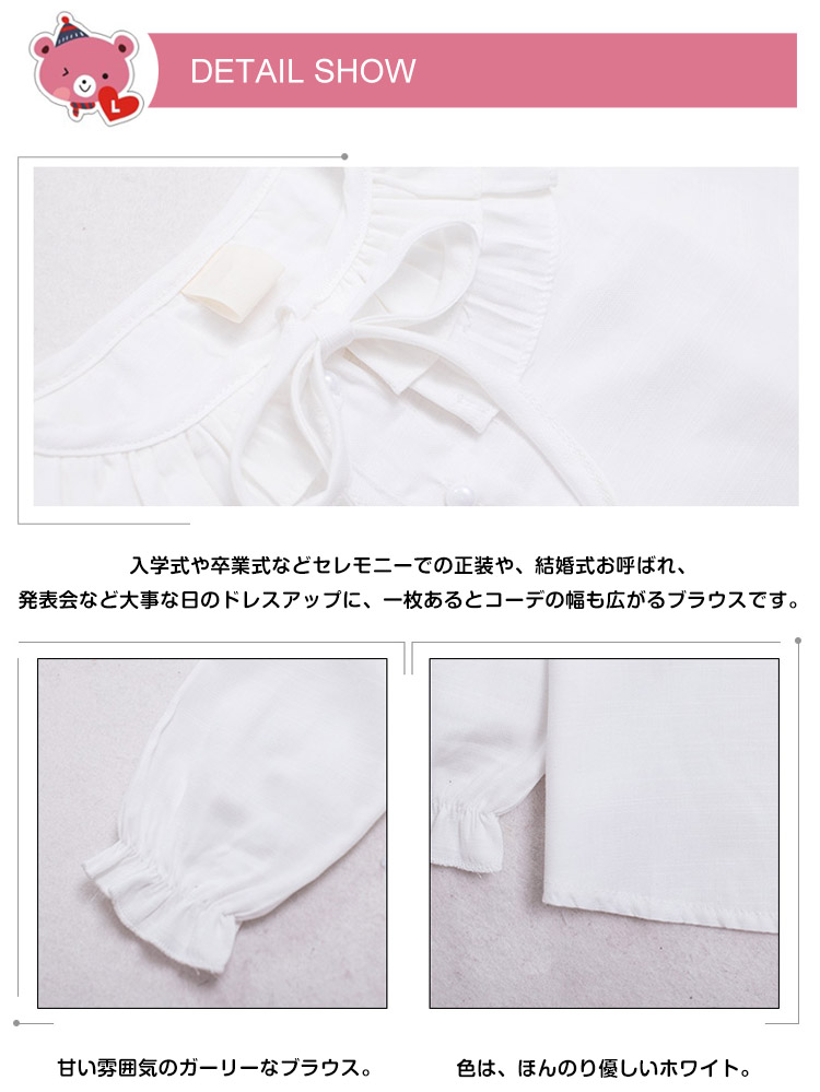 | オールシーズン着られるお姫様ブラウス。やさしい着心地ナチュラルガールに★ フォーマルスタイルもカジュアルスタイルも、アレンジ次第でいろんな表情ができるブラウスです。 | |
