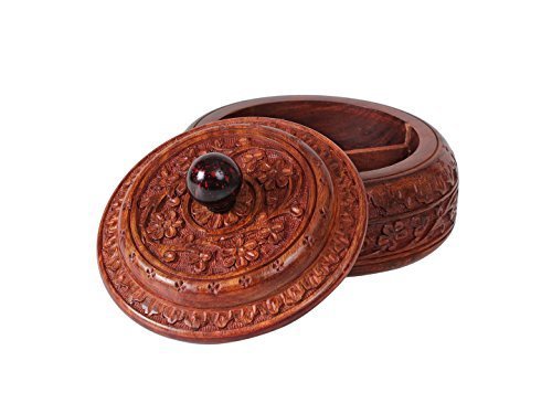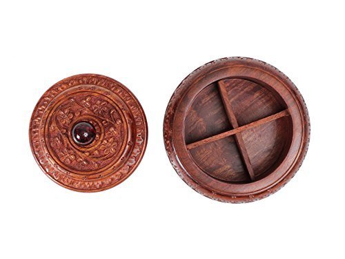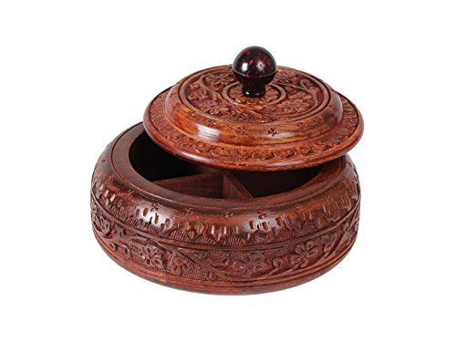 -. Feature : Dimensions: Diameter - 6 inches, Width - 6 inches, Height - 4 inches / Crafted using one of the finest richly hued timbers, rosewood and further adorned with rustic multifaceted carved floral designs. Beautiful wooden box with removable lid provides 4 compartments to store spices, pills, saunf & more / Decorative and functional, an elegant addition to ones kitchen & home decor / Also can be used in restaurant, looks great left out on the table or counter top / Handmade by skilled artisans from Saharanpur - India's largest hub for high quality wooden handicrafts