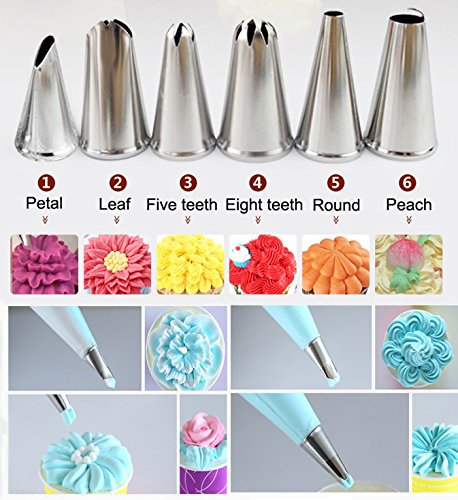- Cake Decoration Tips Set include 6 stainless steel tips and 1 reusable silicone pastry bag ,1 reusable plastic coupler, with which you can create all types of patterns on cake