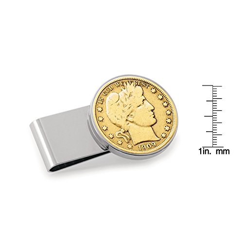 Binding : Apparel Product Description Stylishly simple in design this Silver Tone Half Dollar Coin Money Clip is historical and collectible. Keep your currency secure in the stainless steel two inch money clip featuring a genuine United States Half Dollar. The Silver Barber Half Dollar, struck in .900 Fine Silver was designed by chief engraver of the U.S. Mint Charles E. Barber and was minted from 1892-1915. The obverse design features the head of Liberty. This half dollar is then lavishly layered in pure 24k Gold. 0