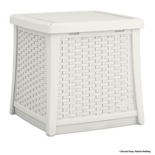 Studio : Suncast Publisher : Suncast Binding : Lawn Patio Product Description Organize your outdoor space and fight clutter with the Suncast Elements Storage End Table. With a chic woven wicker look, this petite end table is a roomy storage cube, too! Keep the gear you need dry and close at hand, from outdoor seat cushions to tools, lawn decor, pool accessories, and more. Rain and snow can't penetrate the steel-reinforced, latching lid. With a five-minute, tool-free assembly process, you'll have this end table set up in no time. The strength of double-walled resin construction and a 13-gallon interior capacity give this piece truly everything you'd expect. Made in the USA. About Suncast Corporation Suncast is known for its high-quality, low-maintenance storage products and accessories. Organize gardens, back yards, garages, basements, and more. Suncast's full line of products includes everything from storage lockers to sheds and bins. Suncast pieces are designed for low-maintenance, worry-free performance that's versatile enough to suit your every need. Dimensions: 18.75L x 18.75W x 18H in.. Double-walled resin construction. Select an available color option. Plenty of concealed, dry storage inside. Hinges are metal and operate smoothly. Steel-reinforced lid latches shut. Attractive wicker texture. Contoured corners don't allow water to pool. 0