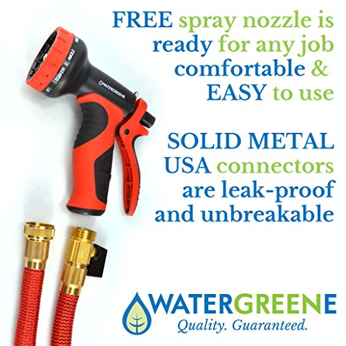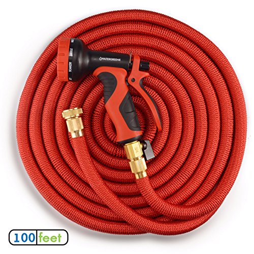 Watergreene Premium Red 100' Expandable Flexible Garden Hose, Light Weight - Includes Spray Gun and Brass Connectors - Expands to 100 Feet Long with Full Guarantee