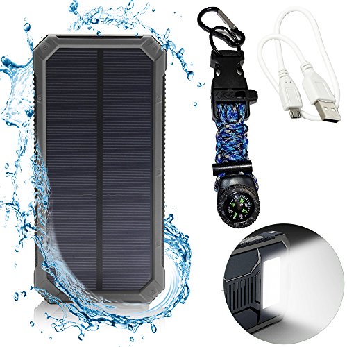 -. Feature : High Quality: Solar Phone Charger - Built-in 12000mAh polymer battery with a compact solar panel that can be used to recharge the battery in case of an emergency. Works with any 5V/1A-2.1A input / Dual USB charging ports: Allows you to charge two devices simultaneously through a 2.1A USB port suitable for iPads/Tablets and a 1.0A USB port for smartphones and other devices. / INCLUDES: Compass, Fire Starter, 10ft of paracord rope, usb cord and Carabiner Clip / Emergency flashlight: The integrated LED flashlight works perfectly for all your outdoor activities and is especially useful in case of an emergency. Includes two modes: constant flashlight, and flashing light for emergency use. / Durable, compact, and portable design: Water-resistant, shock-resistant and dust proof unit is perfect for outdoor activities. The included lanyard and carabiner further increase its utility by allowing you to hang it on your backpack.
