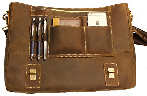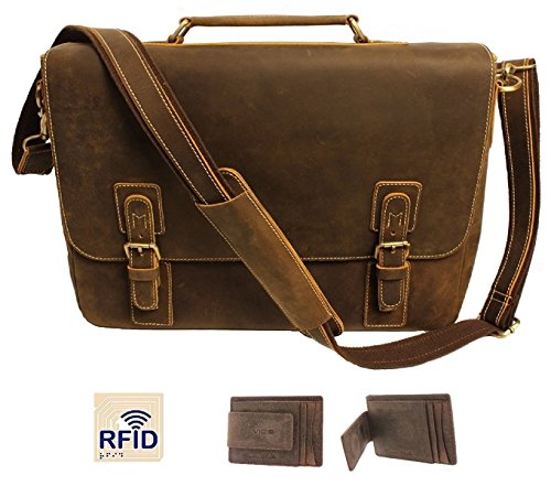 -. Binding : Electronics -. Brand : Viosi -. Color : Hunter -. EAN : 0014567983713 -. Feature : One of a kind on Amazon our bag keeps your credit cards safe from scanners trying to access your data. Made from the finest selection of buffalo hides which unlike cow hides offer maximum strength and minimal stretch. Drum dyed to ensure the most natural feel of leather and color fastness ( will not transfer color) and consistency, locking antique brass hardware and a adjustable leather fronted double padded shoulder strap. / Includes an RFID Magnetic Money clip sold here on Amazon for $24.95. Bag can be used as a messenger bag, laptop bag, cross-body bag, satchel bag, briefcase, travel bag, work bag, business bag or school bag! / Very unique and specially designed front under flap accessory storage area. Interior with compartment pocket which can store your 16" laptop or tablet, back wall zipper pocket, wallet holder, cell phone holder and 2 pen holders. / 30 day money back guarantee. If there are any problems with your bag, please contact us. We will solve any issue and make sure you are 100% satisfied. This is simply one heck of a bag.. / The leather is a natural material and therefore subject to change from hide to hide and with daily use. The color does not transfer onto your clothing due to the drum drying process, unlike our competition. -. Label : Viosi -. Manufacturer : Viosi -. PackageQuantity : 1 -. ProductGroup : PC Accessory -. ProductTypeName : CARRYING_CASE_OR_BAG -. Publisher : Viosi -. Studio : Viosi -. Title : Viosi 16" RFID Genuine Leather Shoulder Messenger Computer Laptop Briefcase Bag w/ Matching RFID Magnetic Money Clip -. UPC : 014567983713