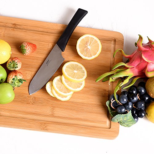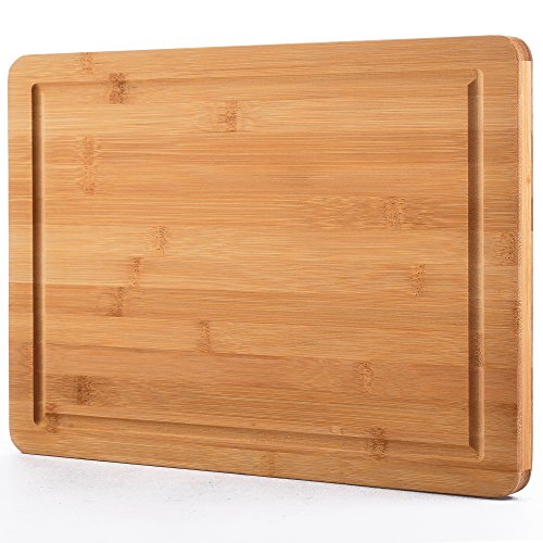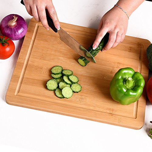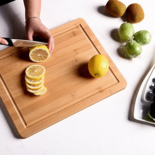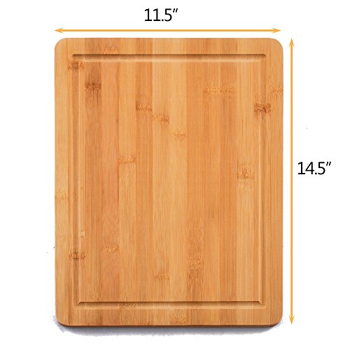 Bamboo wooden cutting board measures approximately 14.5"x 11.5" x 0.7", Extra Large & Durable, providing space for heavy duty vegetable chopping, slicing fruits, and cutting meat.