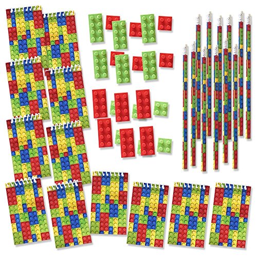 Building Blocks Party Favors Bundle Kit Pack Enough For 12 Kids. 12 building block pencils, 24 building block erasers, & 12 mini notebooks (64 pages). Use for birthday party favors. Great for Lego themed parties!Feature