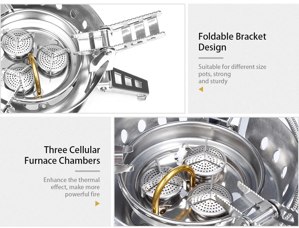 - Three cellular furnace chambers with preheating device spitting the flame evenly and enhancing the thermal effect, making more powerful fire.