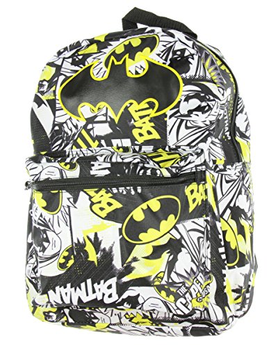 -. Binding : Toy -. Brand : DC Comics -. Color : black, grey, white, yellow -. Department : boys -. EAN : 0644391777440 -. Feature : Backpack measures 12"W x 16"H x 5"D / Superhero print and large logo from the movies and comics / Large zip up compartment and medium zip up accessory pocket / Classic Batman the Dark Knight comic look / Great full size backpack for kids, toddler or teen school and travel -. IsAdultProduct : 0 -. Label : Bioworld -. Manufacturer : Bioworld -. MPN : BP3QCWBTM1 -. NumberOfItems : 1 -. PackageQuantity : 1 -. PartNumber : BP3QCWBTM1 -. ProductGroup : Toy -. ProductTypeName : TOYS_AND_GAMES -. Publisher : Bioworld -. Size : standard -. Studio : Bioworld -. Title : Batman Comic 16 inch Standard Backpack - Kids -. UPC : 644391777440