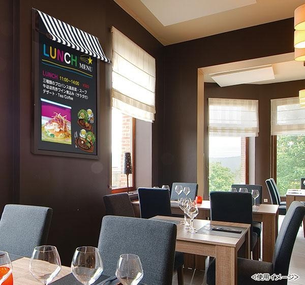 ストライプ模様のテントがアクセント☆雰囲気がグッとアップします!!ボード用マーカーで文字やイラストを描いたり、マグネットで写真等をとめてもオシャレ♪雑貨店、ベーカリー、スーパーマーケットなど様々な用途にご使用いただけます。 |