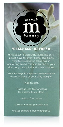 Essential oil blend of Eucalyptus and other natural ingredients gives off relaxing and calming aroma. Mirth Beauty’s Eucalyptus Essential Oil provides antioxidant benefits while releasing a pleasant smell for all