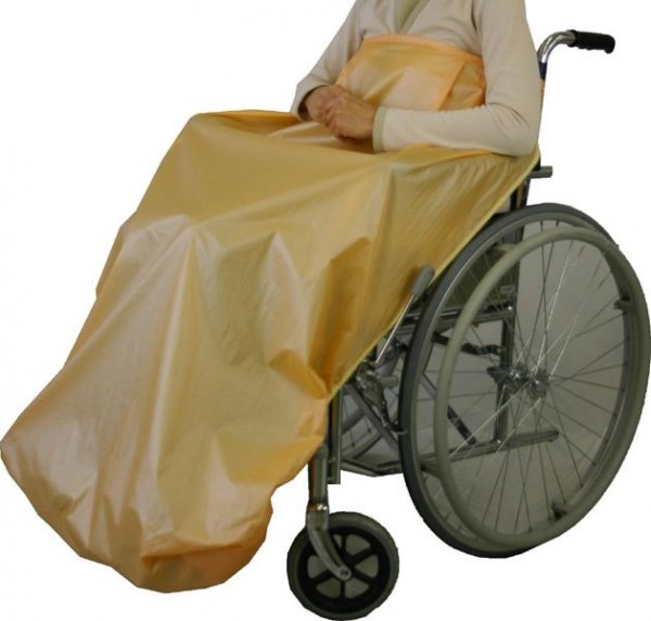 | 車いす用のレインコートです。簡単に装着できます。(前からおおい背中で合わせ、首・背中の着脱テープで固定、足元は両裾をそれぞれレッグパイプに巻きつけ、着脱テープで固定します。) |