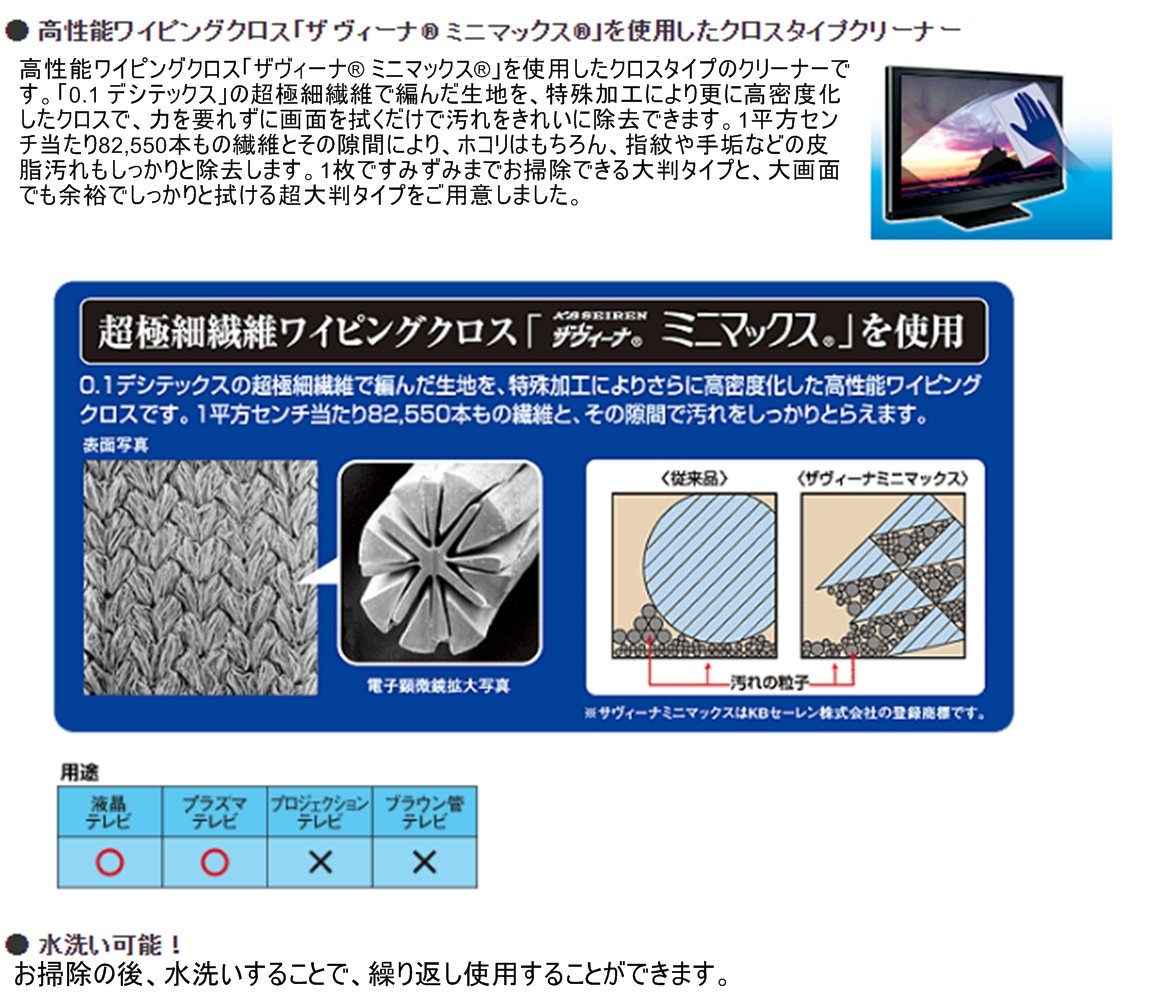 This is a cleaning cloth for TV which adopts ultra microfiber wiping cloth "Savina (R) Mini Max (R)" and wipes the dirt and dust on the TV screen neatly.