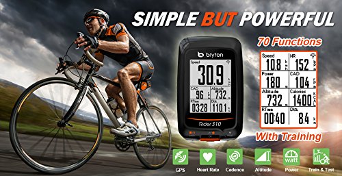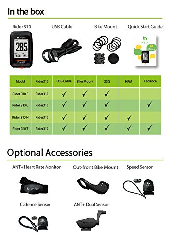 Studio : Bryton Publisher : Bryton Binding : Misc. Product Description Maximum Performance, Half the Price. Weather you expect a cycling computer to be simple for enjoyment, affordable for your budget or powerful for your trainings, the Rider 310 answers them all. No speed sensor installation required, the Rider 310 features Power On and Go with Auto Start/Stop, keeping you in the mood for cycling. New train test feature not only enables you to plan workouts ahead but keeps track of your training progress. Supporting ANT Heart Rate*,Cadence sensor*and Power Meter, the Rider 310 can definitely take your workout to the next level. The large auto backlight easy-to-view screen simultaneously displays up to 70 real time data, incorporating customizable data pages, allowing you to be always on top of your workout. The GPS recording option gives you the opportunity to compare and compete with other cyclists by sharing the recorded FIT files to popular training websites after workouts. Designed for all around cyclists, the Rider 310 is simple, powerful and affordable. 0