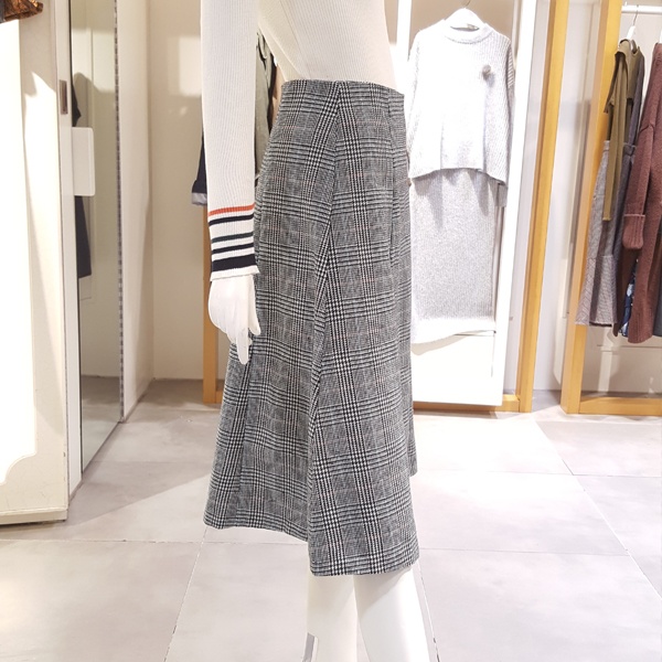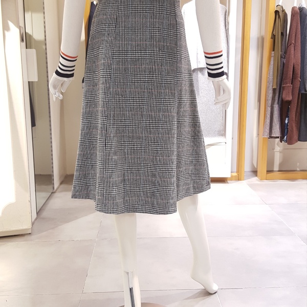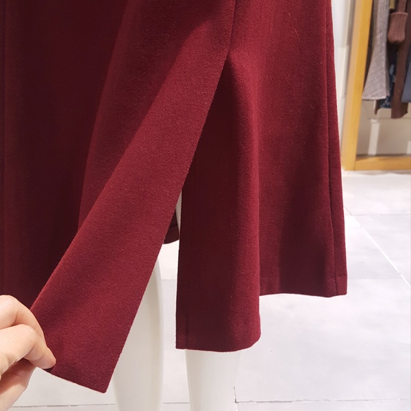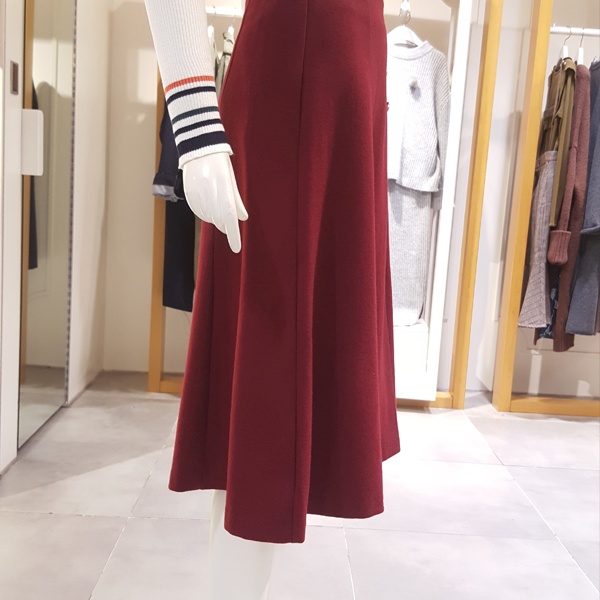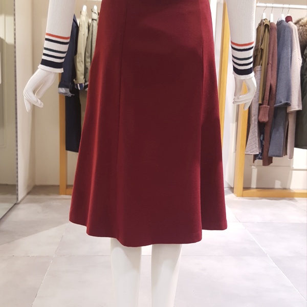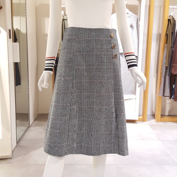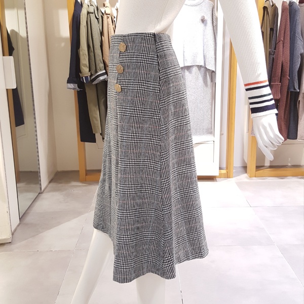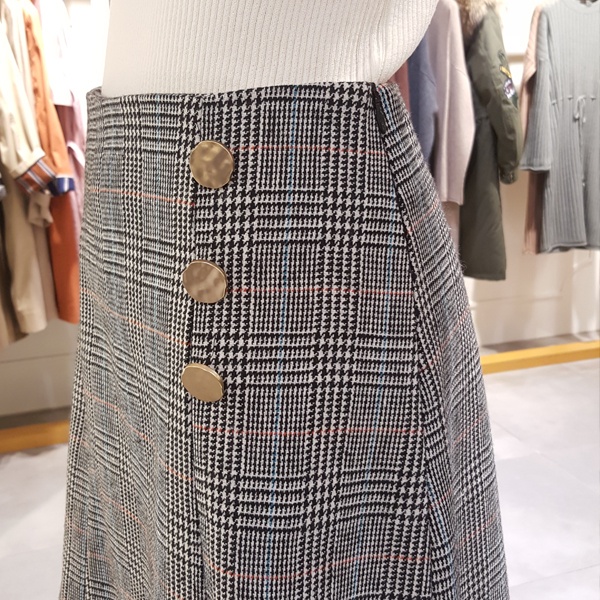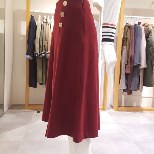 왼쪽에 금빛단추가 시크한 포인트를 주는 플레어스커트입니다 길이감이 길고 밑부분에 트임이 있어 세련된 여성스러움을 줍니다 옆지퍼가 있어 편하게 입으시기 좋습니다