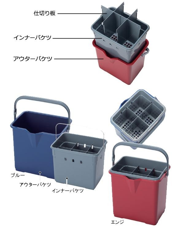 | 濡れた清掃用品を清潔に収納できる二重構造バケツ。コンパクトで各種カートにもセット可能です。底仕切板とカップもセットに含まれており、最大10区分が可能。トイレ清掃から各種メンテナンスまで幅広く活躍します。 |