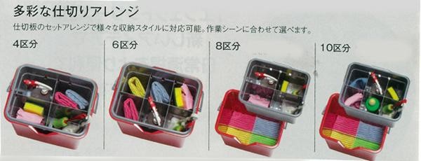 | 便利な仕切り板と2重構造バケツで資機材の持ち運びも楽々。 |