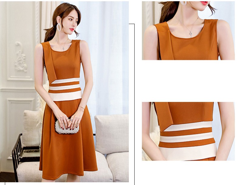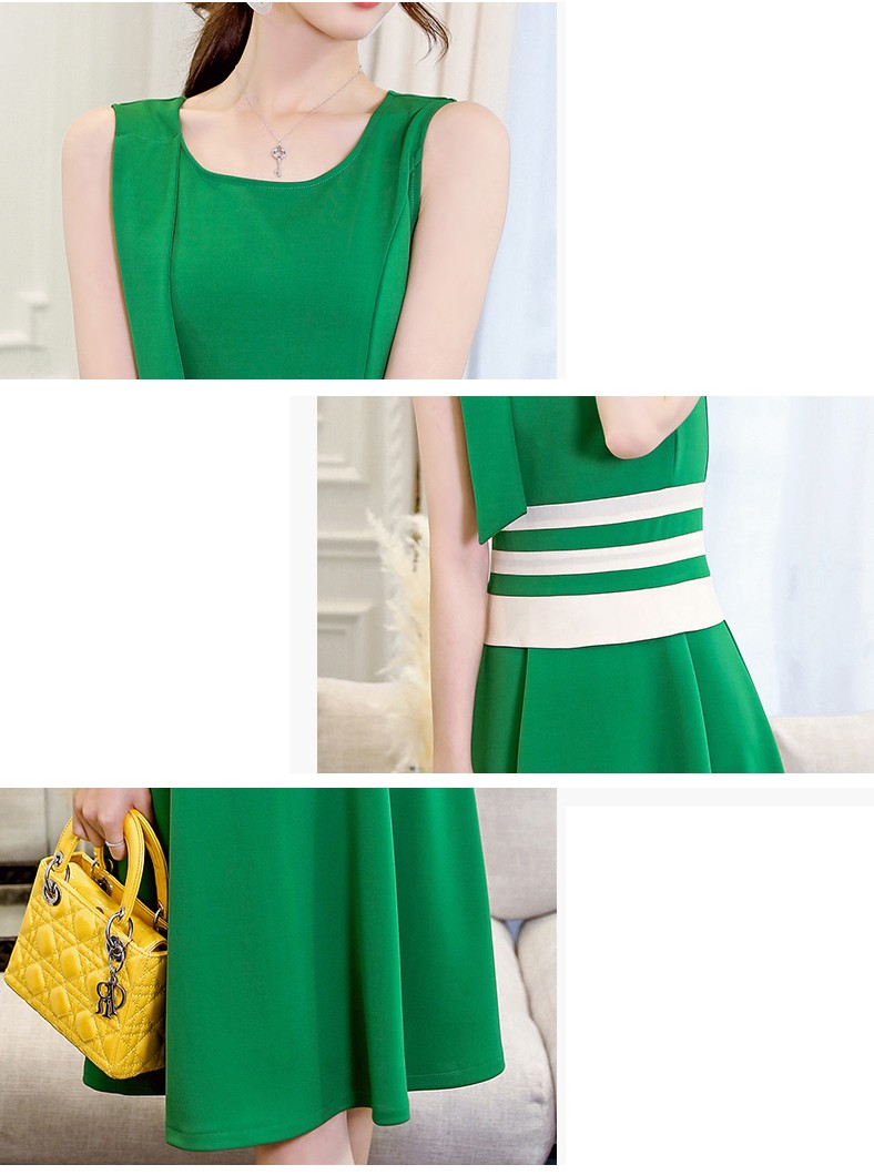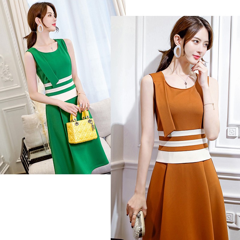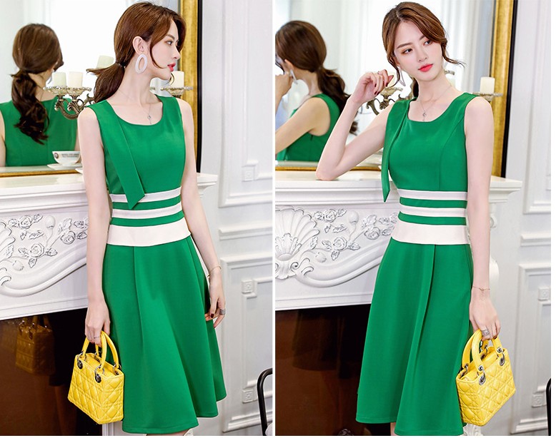 グリーン・キャメル地のウエスト部分にホワイトボーダーデザインのワンピ♪