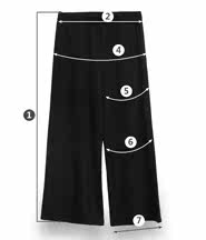 | 尺码 | ①裤长 | ②腰围 | ③腰围(拉量) | ④臀围 | ⑤大腿围 | ⑥膝围 | ⑦脚围 | ⑧前裆 | ⑨后裆 | ||