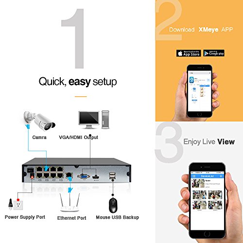 -. Feature : SIMPLIFIED POWER OVER ETHERNET- True PoE technology, a single network cable directly connects each IP camera to the NVR, supplying both power and video signal.No more video cable or camera power adapter is needed, much simplifying the wiring trouble. / QUICK REMOTE ACCESS- Connect your tablet or Smartphone to your IP cameras or NVR with the free app via QR Code Scan, available for both Android and iOS devices. / STUNNING EXPERIENCE: Crystal clear 1 Mega Pixels 720P 1280X720 Video at 30fps, 75° wide view angle lens.Free central management software, monitor different locations at one screen.Multiple recording modes, intelligent motion detection, email alert.Supports ONVIF compliant IP cameras. / DAY AND NIGHT FULL DAY MONITORING - Each IP camera houses premium IR LEDs inside of it and is capable of recording up 100ft / 30M super long night vision with auto IR-Cut switch.