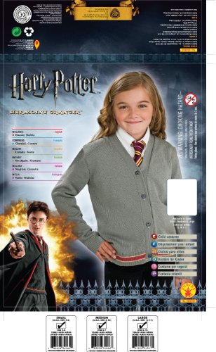 -. Binding : Toy -. Brand : Rubie's -. ClothingSize : Large 12-14,Medium 8-10,Small 4-6 -. Color : Grey -. Department : unisex-child -. Feature : Authentic Hogwarts detailing / Great for play time or party time / Review the Rubie's Child's Size Chart for detailed information, this sweater does fit loosely (runs large) and a smaller size may be more appropriate if child is near the bottom of the size range listed / Since 1950 Rubie's Costume Company has been making dress-up fun with costumes and accessories for the entire family -. IsAdultProduct : 0 -. Label : Rubies - Domestic -. Manufacturer : Rubies - Domestic -. Model : 883406 -. MPN : 883406 -. PackageQuantity : 1 -. PartNumber : 883406 -. ProductGroup : Toy -. ProductTypeName : CHILDRENS_COSTUME -. Publisher : Rubies - Domestic -. Size : Large 12-14,Medium 8-10,Small 4-6 -. Studio : Rubies - Domestic -. Title : Harry Potter Hermione Granger Hogwarts Cardigan and Tie Costume -. Warranty : No Warranty