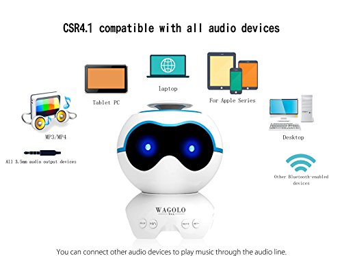 -. Binding : Electronics -. Brand : WAGOLO -. Feature : This mini bluetooth speaker is with high power woofer,unique bass technology, no matter bluetooth connection or MP3 play,or AUX connection,you will enjoy amazing sound, suitable for kids, adult, party, yoga, living room, bedroom. / Built-in mic supports hands-free phone calls or voice chat when connected to your phone.Outstanding bluetooth connection range of up to 33 feet for convenient wireless freedom.Auto color-changing led light,ideal for giving you a warm atmosphere at night. / With mini micro TF card slot, you can play mp3 / mp4 format files in the TF card. Up to 10 hours playtime powered by an internal long-lasting rechargeable lithium battery. -. Label : WAGOLO -. Manufacturer : WAGOLO -. PackageQuantity : 1 -. ProductGroup : Speakers -. ProductTypeName : PORTABLE_AUDIO -. Publisher : WAGOLO -. Studio : WAGOLO -. Title : WAGOLO BT5 Bluetooth Speakers