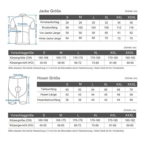 -. Feature : Bitte aufpassen! Das Trikot und die Hose sind separat verkauft.Vielen Dank für Ihre Aufmerksamkeit. / Über die Größe von Trikot,bitte wählen Sie 1 oder 2 Nummer größer,die Sie gewöhnlich trägt. / Material: Trikot aus 100% Polyester, Hose aus 90% Polyester, 10% Lycra; / Eigenschaft:Schweißaufnahme,UV-Schutz,Weich,Atmungsaktiv,Ultralight,Elastisch,Wasseranziehend / Inner Shorts gibt es ein 3D Sitzpolster, lässt Ihr Radfahren stoßdämpfend und bequem;