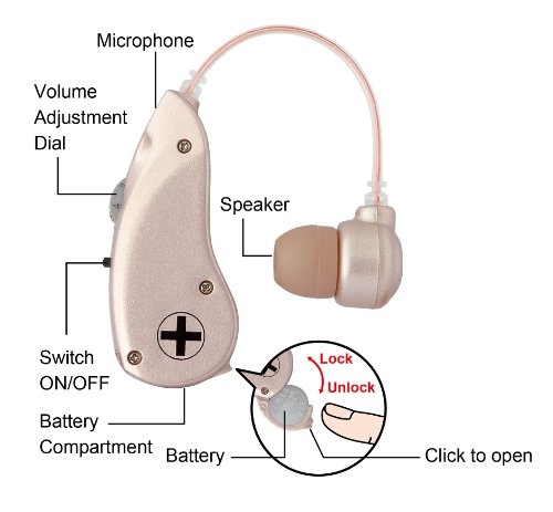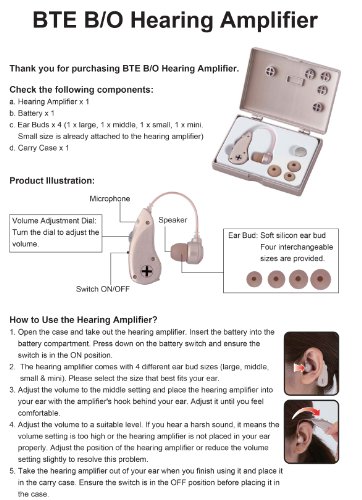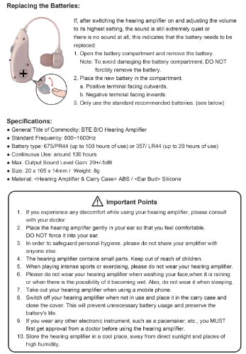 -. Feature : EASY USE: The personal sound amplifier is simple to use. It comes with an on and off button along with a volume dial. Simply adjust the settings then plug it into your ears. It also comes with a handy carrying case, great for travel. / BEST FIT: The personal sound amplifier is designed for people who have a slight hearing impairment. It comes with 4 different size of ear buds (Large, Medium, Small and Mini) and fits either on the left or right ear. / HOUR USAGE: The personal sound amplifier includes one LR44 / 357 / 76 button cell battery that can be use for up to 20 hours. / SOUND QUALITY: The specially engineered IC chip board is able to manipulate the sound quality that is produced by the speakers to give a more immersive sound quality, the hearing amplifier produces sounds that are remarkably different to other hearing amplifiers. / AFFORDABLE: Most of our clients say that our personal sound amplifiers are better than hearing amplifiers that are on the market costing them 3 -5 times more.
