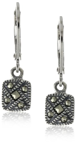-. Feature : Sterling silver drop earrings featuring etched square pendants inset with small marcasite stones / Lever-back closures / Imported