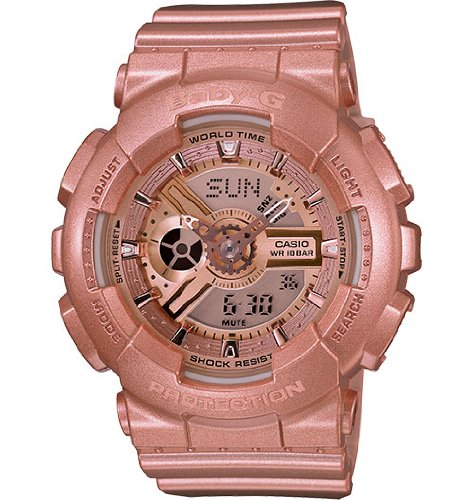 Metallic pink gold-tone resin case and bracelet. Fixed pink gold-tone resin bezel. Pink gold dial with skeleton hands and index hour markers. Minute markers around the outer rim. Dial Type: Analog-digital. Full auto calendar. Quartz movement. Scratch resistant mineral crystal. Solid case back. Case dimensions: 46.3 mm x 43.4 mm. Case thickness: 15.8 mm. Round case shape. Tang clasp. Water resistant at 100 meters / 330 feet. Functions: hour, minute, second, world time, led backlight, hourly time signal, 1/100 second stopwatch, 12/24 hour formats. Sport watch style. Casio Baby G Pink Gold Metallic Resin Ladies Watch BA111-4CR.