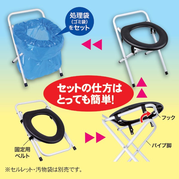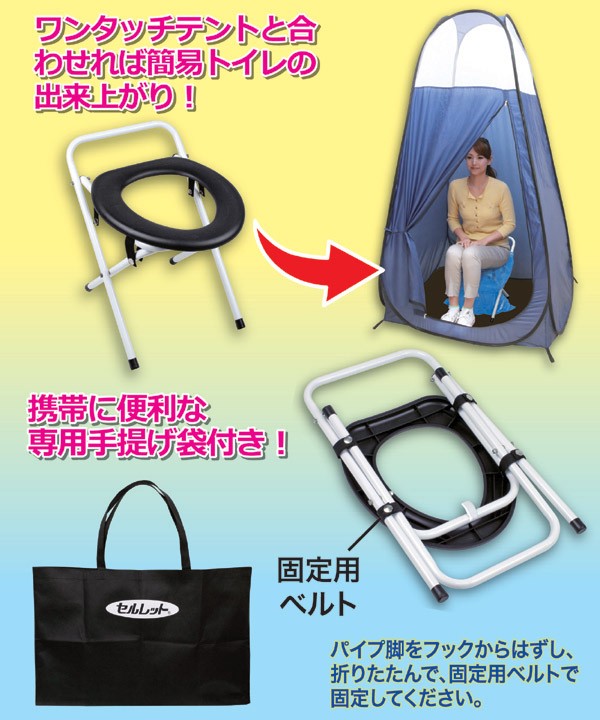 突然!思わぬ災害!・・・こんな時に、人間は生きるために食事をし排泄をする。最も原始的なことかもしれませんが、これが一番大事なことです。そんな時に、即席で用意できる洋式型便座です。パッと広げるだけで洋式便座になり、折りたたんで専用収納袋に入れればコンパクトに収まります。ビニール袋を掛けてご使用ください。姉妹品の「ワンタッチテント」「セルレット」と一緒にご使用をオススメします。