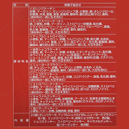 原材料:〈オレンジケーキ〉砂糖、マーガリン、オレンジシロップ漬、小麦粉、卵、オレンジピール砂糖漬、洋酒、蜂蜜、食塩、膨脹剤、酸味料、酸化防止剤(V.C)、香料、(原材料の一部に乳を含む)〈ミックスベリーケーキ〉卵、小麦粉、砂糖、マーガリン、ストロベリー砂糖漬、転化糖、ドライクランベリー、ショートニング、ドライブルーベリー、食塩、乳化剤、膨脹剤、コチニール色素、香料、酸味料、(原材料の一部に乳.大豆を含む)〈アッブルシュトロイゼル〉小麦粉、卵、マーガリン、砂糖、りんごシロッブ漬、転化糖、水あめ、ショートニング、食塩、シナモン、加エデンフン、乳化剤、膨脹剤、香料、酸味料、酸化防止剤(V.C)、(原材料の一部に乳、大豆を含む)〈抹茶ショコラケーキ〉小麦粉、卵、マーガリン、砂糖、水あめ、ビターチョコレート、転化糖、ホワイトチョコレート、クリーム(乳製品)、アーモンドプードル、ショートニング、抹茶、食塩、乳化剤、膨脹剤、着色料(紅麹、クチナシ)、香料、(原材料の一部に大豆を含む)〈ニューヨークブラウニー〉卵、チョコレート、砂糖、マーガリン、小麦粉、水あめ、くるみ、ココアパウダー、膨脹剤、香料、(原材料の一部に乳、大豆を含む)〈ショコラクッキー〉小麦粉、バター、チョコレート、砂糖、ココアパウダー、食塩、乳化剤、香料、(原材料の一部に大豆を含む)〈ストロベリークッキー〉小麦粉、マーガリン、砂糖、ドライストロベリー、加糖卵黄、ストロベリーパウダー、酸味料、香料、着色料(赤40、赤102、カロテノイド)、(原材料の一部に乳、大豆を含む)〈キャラメルクッキー〉小麦粉、マーガリン、砂糖、加糖卵黄、アーモンド、乳等を主要原料とする食品、キャラメルペースト、食塩、着色料(カラメル、力ロテノイド)、香料、(原材料の一部に大豆を含む)〈塩バタークッキー〉小麦粉、バター、砂糖、加糖卵黄、食塩、香料