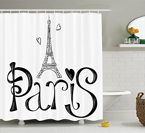 Ambesonne Paris City Decor Collection, Eiffel Tower France Heart Shapes Silhouette Decorative Vacation Art Design, Polyester Fabric Bathroom Shower Curtain Set with Hooks, Black and White