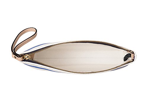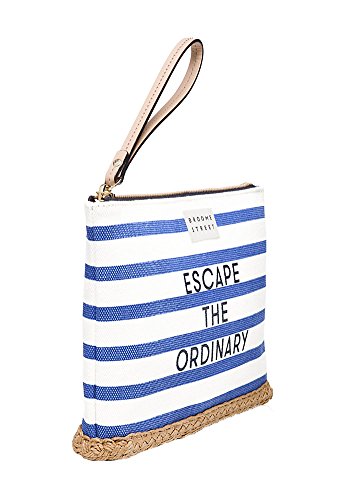 -. Brand : New York -. Color : Blue/Cream -. Department : womens -. EAN : 0098689940588 -. Feature : Clutch wristlet in striped canvas trimmed in straw. / Front 'Escape the Ordianry' text. Front signature broome street logo. / Zip top closure w wristlet zipper pull. Unlined. / 6.75''h x 9.5''w X 2"D -. Model : PWRU4947 -. ProductGroup : Shoes -. ProductTypeName : HANDBAG -. Title : 'Escape The Ordinary' Medium Bella Wristlet, Blue/Cream -. UPC : 098689940588