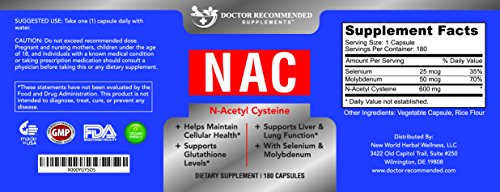 -. Binding : Health and Beauty -. Brand : Doctor Recommended -. EAN : 0689407697534 -. Feature : All Doctor Recommended Supplements are 100% Guaranteed or your money back / BEST QUALITY NAC supports the body's fight against symp relating to bronchitis, ear infections, and hangover. Provides support for a healthy heart as well. / You may also find that our VEGAN-FRIENDLY NAC SUPPLEMENT helps increase your energy and supports faster recovery after a sports injury. / Our NAC is MADE IN the USA IN A STRICT cGMP and FDA-CERTIFIED LAB. / AN ESSENTIAL SUPPLEMENT that provides support for fighting many other ailments -. IsAdultProduct : 0 -. Label : Norax Supplements -. LegalDisclaimer : These statements have not been evaluated by the Food and Drug Administration. This product is not intended to diagnose, treat, cure, or prevent any disease. -. Manufacturer : Norax Supplements -. MPN : 689407697534 -. PackageQuantity : 1 -. PartNumber : 689407697534 -. ProductGroup : Health and Beauty -. ProductTypeName : HEALTH_PERSONAL_CARE -. Publisher : Norax Supplements -. Studio : Norax Supplements -. Title : High Quality NAC - 600 mg - 180 Veggie Capsules - by Doctor Recommended Supplements-Supports a Healthy Liver and Overall Health and Immunity -. UPC : 689407697534