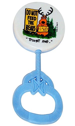 The picture shows a bear wearing antlers and holding a sign that says "I Am Not A Bear" while standing next to a very large sign that says (in capital letters) "DO NOT FEED THE BEARS". It has graphics on one side of the rattle head and a solid pastel color on the other side. Rattles measure approximately 5"L x 2 1/2"W x 1/2"D.Feature