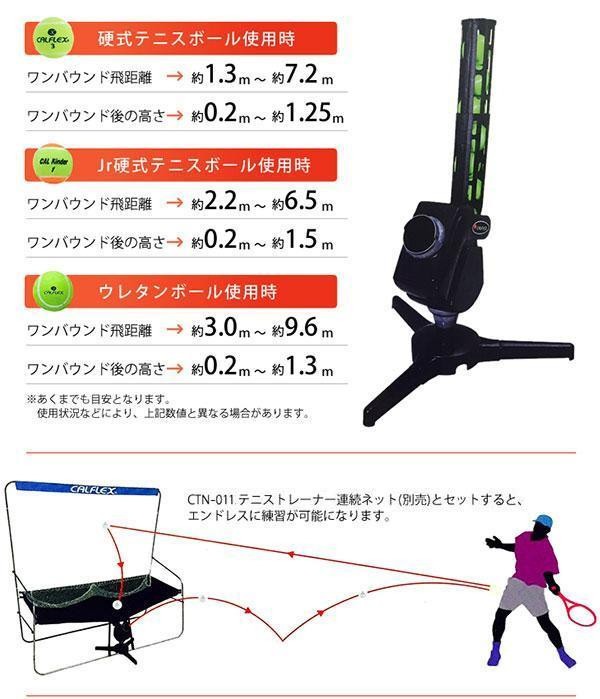 | 仕様 | ●組立式 ●対応球:硬式テニスボール、Jr硬式テニスボール、ウレタンボール ●電源:単2アルカリ乾電池4本(別売)もしくは専用ACアダプター(別売) ●連続稼働時間(アルカリ乾電池使用時):約3時間※電池状態・使用環境による ●発射間隔:約7秒 ●対象年齢:7歳以上 |