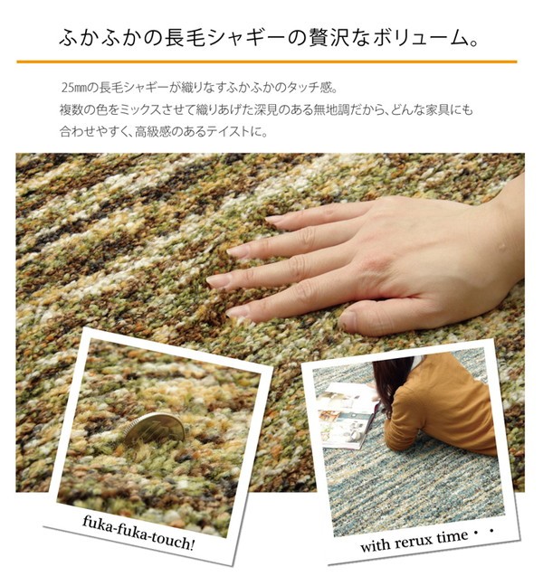 本場ベルギー製のウィルトン織りカーペットです。パイル長約25mmの毛足が長いシャギータイプです。柄は無地調で若干のグラデーションもプラスしました。家具やお部屋にも合わせやすい、特にモダンな色目にこだわった商品です。本商品のパイル部分にはポリプロピレン素材を使用しております。ポリプロピレンはヘタリにくく、耐久性に優れ、繊維の中でも軽い素材です。また、汚れが付着しにくく、遊び毛や毛玉が非常に出にくいという特徴もあります。本商品にはフリーゼセット加工を施しております。フリーゼセット加工でパイルをツイストすることによりボリューム感を出し、ふかふかとした肌感触に仕上げました。ホットカーペットカバーや床暖房にも対応しております。安心して年間お使い頂けるカーペットです。