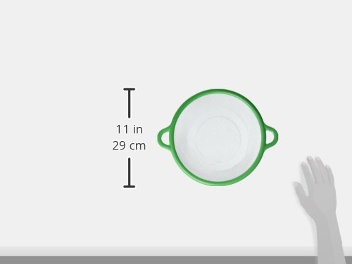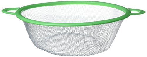 - Information: drain Pasta, sift Flour and clean fruits and vegetables with this round metal Mesh strainer featuring a round shape with a colored plastic edge in either green, pink or blue