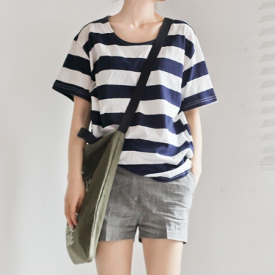 와이드한 폭의 스트라이프 패턴이 시원시원한 스트라이프 티셔츠입니다. 쇄골이 살짝 보이는 라운드넥으로 스트라이프 패턴이 지루해질 때는, 이렇게 스트라이프 변형패턴은 어떨까요 :) 무지티에 비해 비침걱정도 없어서, 더욱 실용적인 스트라이프 티셔츠입니다.
