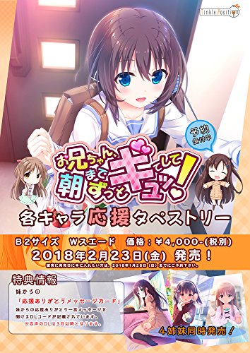 -. Feature : 2018年春発売予定のPCゲーム『お兄ちゃん、朝までずっとギュッてして! 』の応援タペストリーが販売決定しました! / 女未(おなみ)四姉妹「女未 そら」「女未 あかね」「女未 こはく」「女未 すみ」のB2Wスエードタペストリーをゲームに先行して販売いたします。 / 女未(おなみ)四姉妹のキャラクターがよく判るタペストリーとなってますので、あなたのお気に入りの妹を、応援してあげて下さい。 / 特典:『妹からの「応援ありがとうメッセージカード」』付属 / ※本製品はグッズとなります。CD-ROMは付属致しておりません。