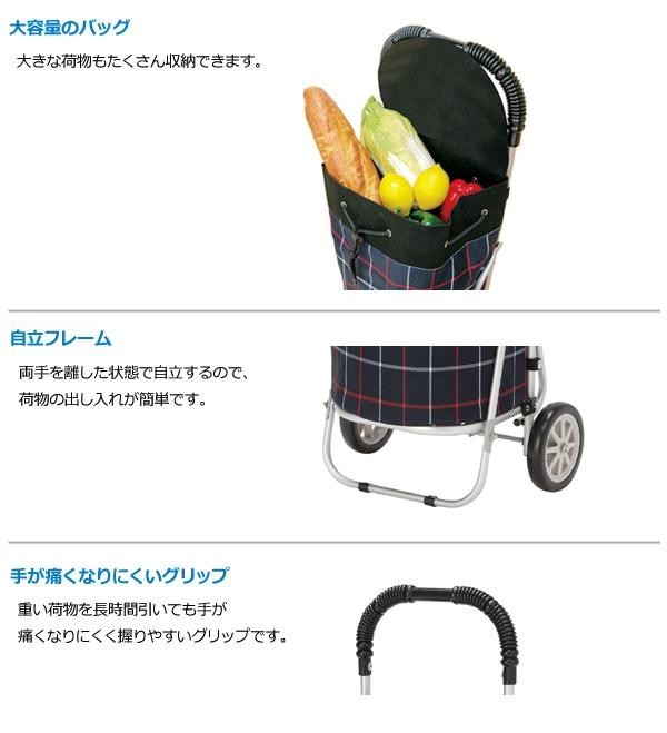 大きな荷物もたくさん収納できる大容量ショッピングカートです。両手を離した状態で自立するフレームで、荷物の出し入れが簡単。グリップは握りやすく、重い荷物を長時間引いても手が痛くなりにくいので、ちょっと遠くへのお出かけにもオススメです。 |
