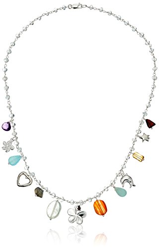 Handmade Sterling Silver Charm Drop with Multi-Color Bead and Linked Aquamarine Chain Choker Necklace, 18"