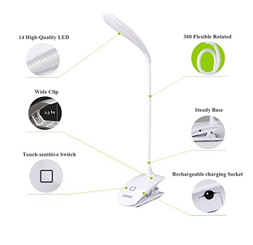 Rechargeable Book Light,Ofspower LED Flexible Book Table Lamp with Clip-On Clamp,Touch Sensor and 3-Level Brightness for Reading,Studing, Bed and Desk