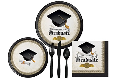 -. Title : Graduation Party Supply Pack for 8 Guests - Bundle Includes Paper Plates, Napkins and Cutlery in a Traditional Design Perfect for Grad School, College, or High School Graduation Celebrations
